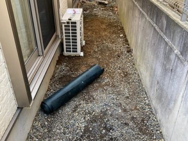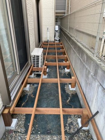 防草シートを施工して、ピンコロを設置。根太・大引を設置している様子です。
