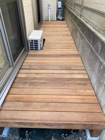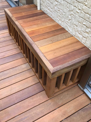 室外機は下に置いたまま、サッシとサッシの間に、はめ込むように横長のベンチカバーを設置しました。 置いてあるだけなので、室外機のメンテナンスが可能です。 こちらもウリンで製作しました。