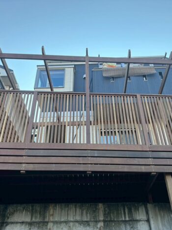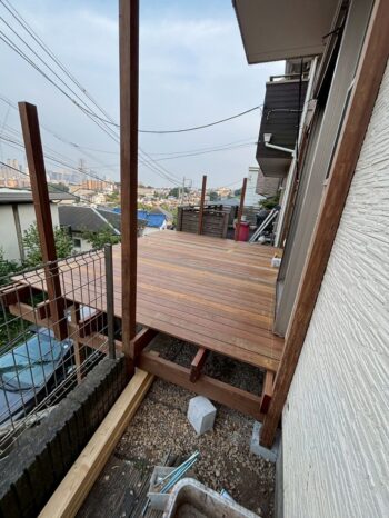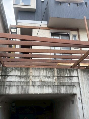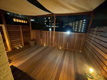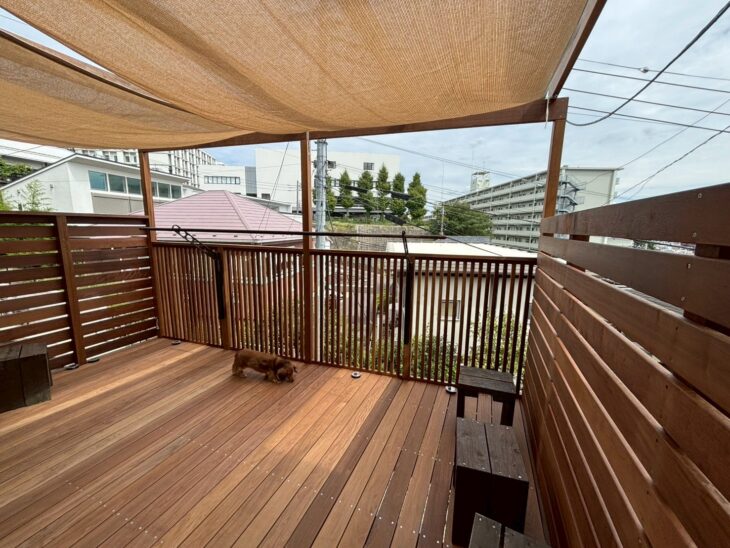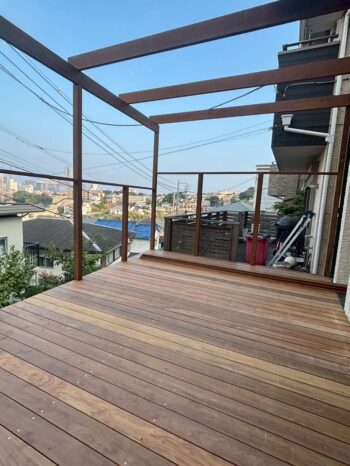 床面のサイズ感、正面のフェンスは既存デッキをあまりデザインを変えずに、サイドのフェンスは目線が気にならないよう、既存デッキよりも高く、横張りのデザインに変更しました。木材の渋が出ない物をご希望だったので、床、パーゴラはイペを使用しました。