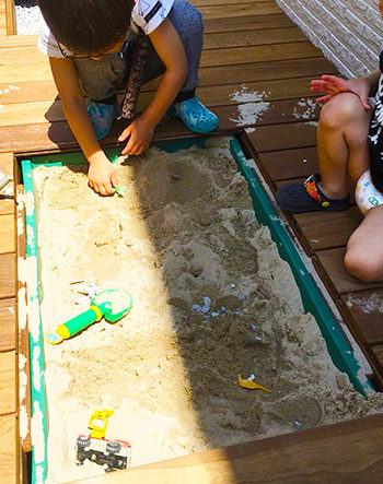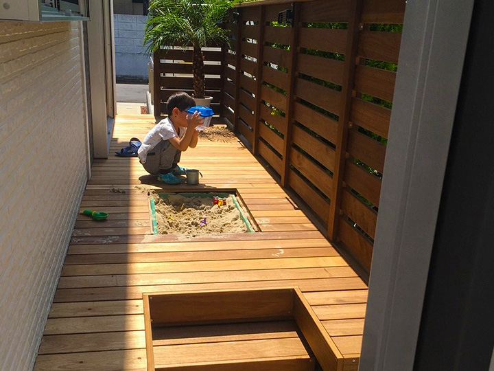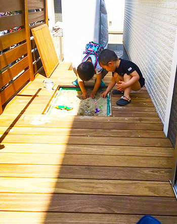 このお宅では初の取り組み、ウッドデッキに砂場を作りました。自宅だから安心安全ですね!