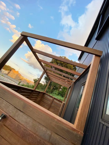 パーゴラも設置。シェードなどの日よけも取付可能です。
