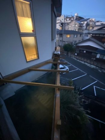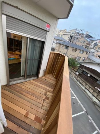 下の道路から見たはね出しウッドデッキ