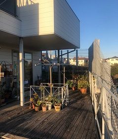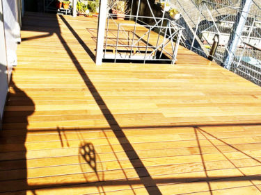 大工のお父様が製作したデッキを心をこめて解体した後、ハードウッドの規格+鉄骨の下地に合わせて貼り方向を以前と比べて反対にご提案+サッシから低かったデッキフロアのラインを高くするご提案をしました。