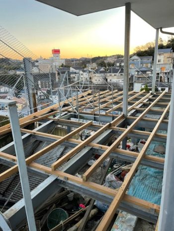 お父様が製作したデッキを心をこめて解体、その後鉄骨の下地を利用して基礎を組んでいきます