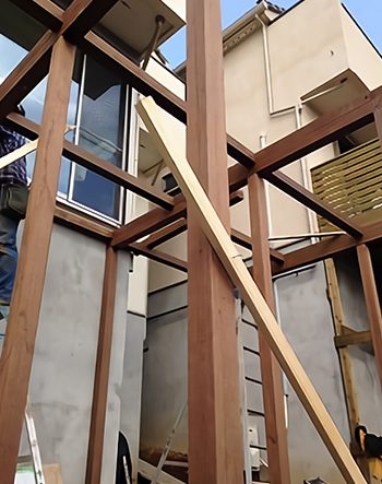 ベランダハイデッキの組み立て作業の様子です。