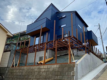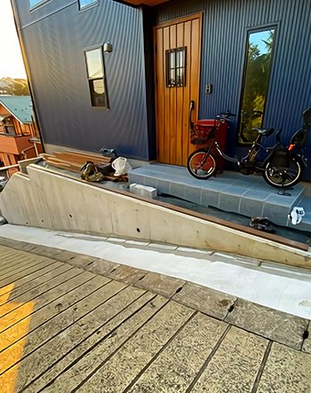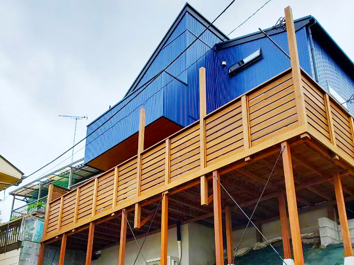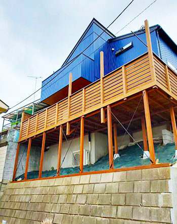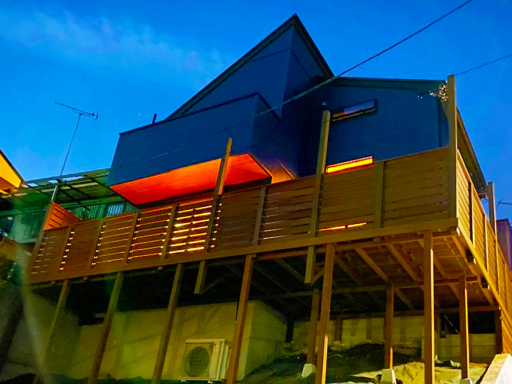 斜面のウッドデッキ、可能な範囲で広くお使いいただけるように設計しました。