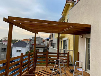 また、夏の日差し対策にパーゴラも設計・設置しました。シェードもつけられますし、快適ですね!
