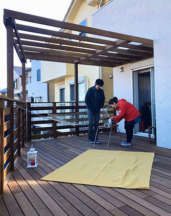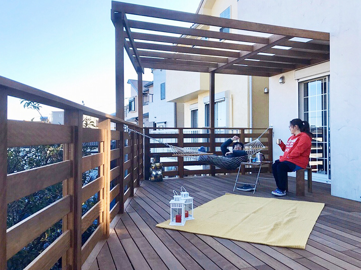 ウッドデッキには絶対ハンモックをつけたいというご希望が叶いましたね。素敵なウッドデッキに仕上がりました。