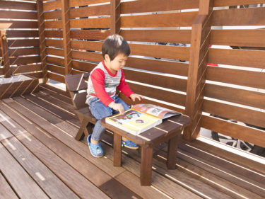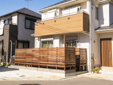 新築住宅エリアに建つY様宅。プライベート空間をきちんと保ちつつ、エリアになじむように隠しすぎないウッドデッキを設計しました。また、敷地を最大限活用するべく、デッキの内側にステップを組み込んだ設計で、平面部分を大きくとりました。
