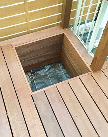 またお花や木を取り入れたいとのご希望でしたので、シンボルツリーとして設置できるよう、植栽用にボックスの設置をご提案しました。