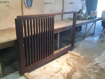 90mm角材に溝をついて敷居を作製しました。溝にレールをはめ込み格子枠の下端に戸車をセットしています。