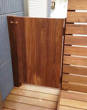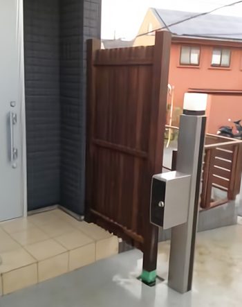 ウッドフェンスと同材で統一し、使い勝手とデザイン性を両立。開閉の軽さにも配慮したオーダーメイド仕様です。