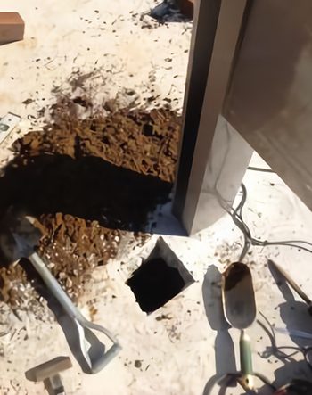 玄関前に立てる支柱を埋め込むために土間コンクリートの一部を四角く穴を空けて、土を掘っていきます。