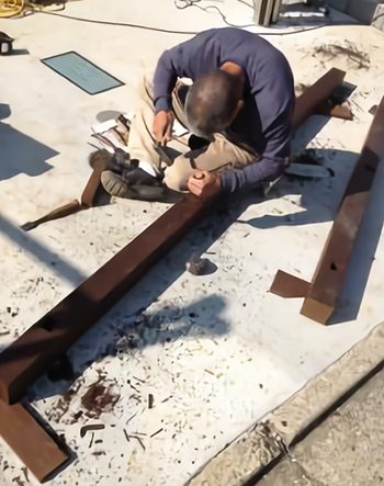 材を積み上げて、連結していくシンプル工法です。扉は歪まないように接地面積を多くとるように作製します。