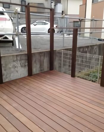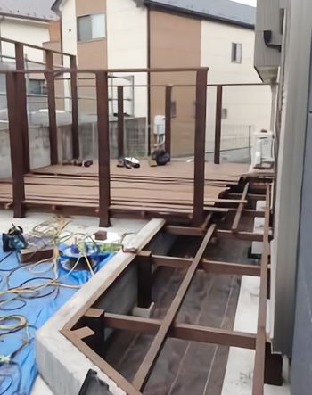 ウッドデッキの床面が組み上がり始めた段階です。隣地の駐車場との高低差を考慮し、目隠しフェンスの支柱が設置されています。プライバシーを守る構造づくりが進んでいます。