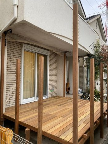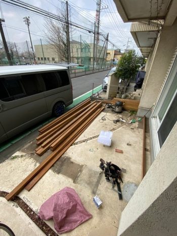 初日は材の搬入、基礎工事を行います。今回採用したのはイタウバというハードウッド。関東では人気のハードウッドです。