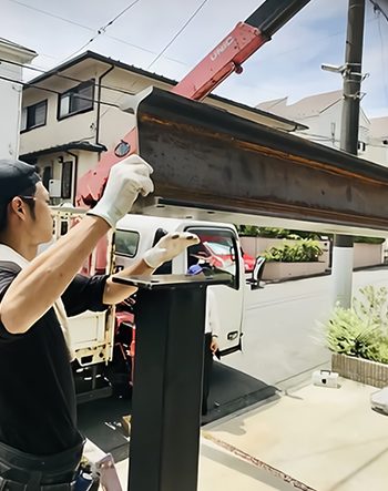 ユニックを使って、鉄骨鋼材の搬入と設置を行います。