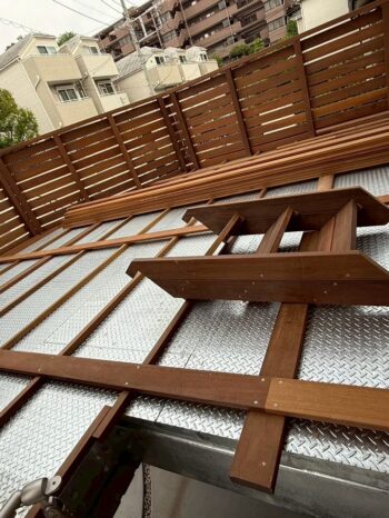 鉄板の上にウッドデッキを作っていきます。