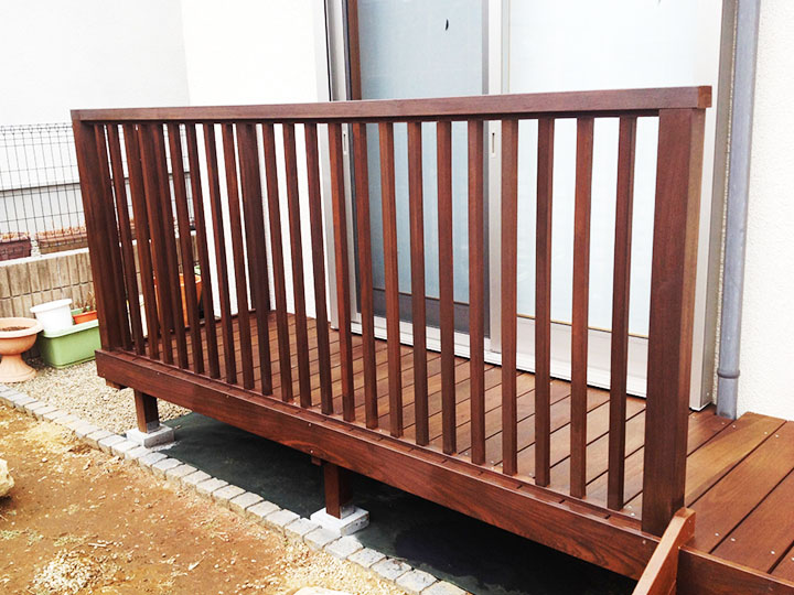 中古の住宅をご購入されたお客様は、引っ越されてからウッドデッキを作りたいと考えおり、1階の掃き出し窓から楽にお庭に出るアプローチと小さいお子様の落下防止の役目を望んでいました。 タイミングよく弊社のチラシをご覧いただいて、工事することになりました。 縁側のようにできて、土や芝生の部分を残しつつウッドデッキを作りたい、さらに立水栓を取り替え、布団が干せる場所を確保したい、とのご要望でした。
