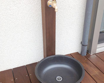 木製水栓柱はデッキ材と同じ素材で制作し、蛇口や排水パンはお客様にご購入いただきました。