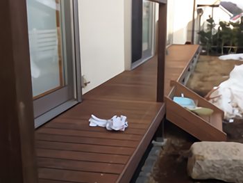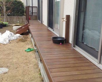 中古の住宅をご購入されたお客様は、引っ越されてからウッドデッキを作りたいと考えおり、1階の掃き出し窓から楽にお庭に出るアプローチと小さいお子様の落下防止の役目を望んでいました。 タイミングよく弊社のチラシをご覧いただいて、工事することになりました。 縁側のようにできて、土や芝生の部分を残しつつウッドデッキを作りたい、さらに立水栓を取り替え、布団が干せる場所を確保したい、とのご要望でした。