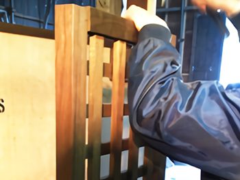 西側に布団を干せるようにフェンスを高めに取り付け、縦格子は一体で組んでいます。上の笠木と下枠のビスを外すと簡単に取り外すことができます。