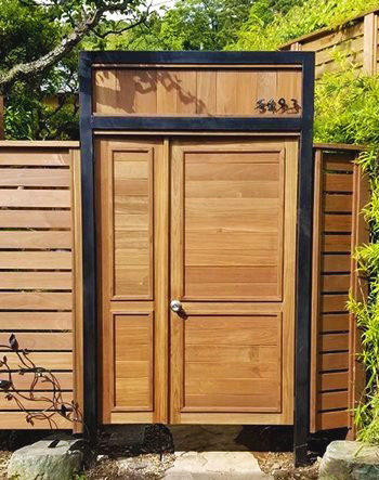 入り口となるエントランスは、ウッドデッキと同じ材でオリジナルアイアン扉を造作設置しました。