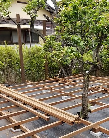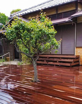 エントランスから入口までの広いスペースを、ウッドデッキに施工します。