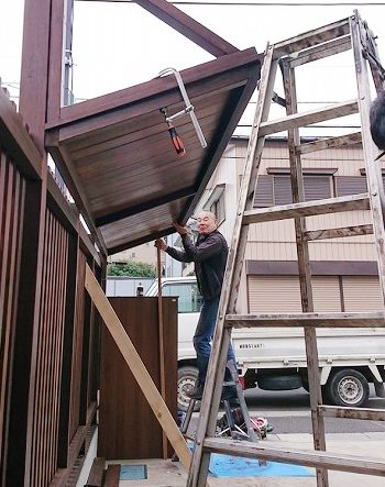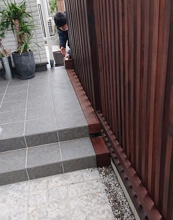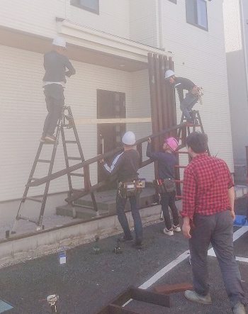 横の駐車場からの侵入を防ぎ、目隠しも兼ねて、ウッドフェンスをたてていきます。