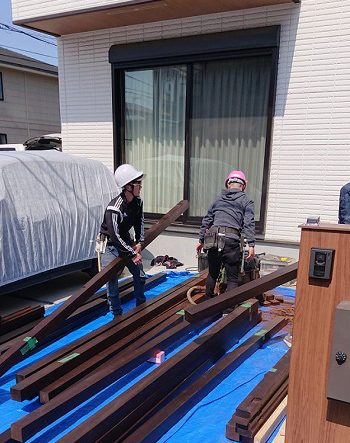 初日、材の搬入から組み立てです。養生から材搬入も効率よく進めます。