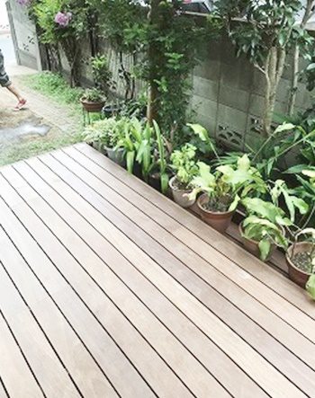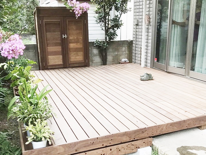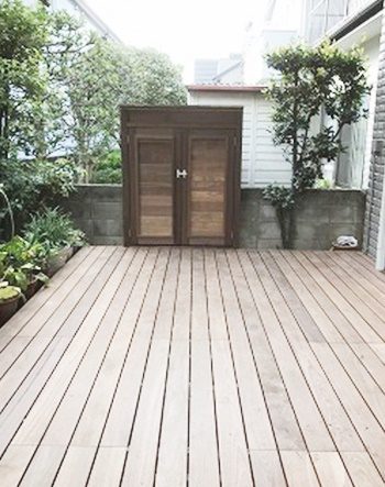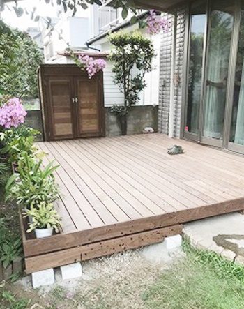 | 施工内容 | ウッドデッキ工事/植栽伐採/造作プランターボックス/物置造作/水栓設置工事 |